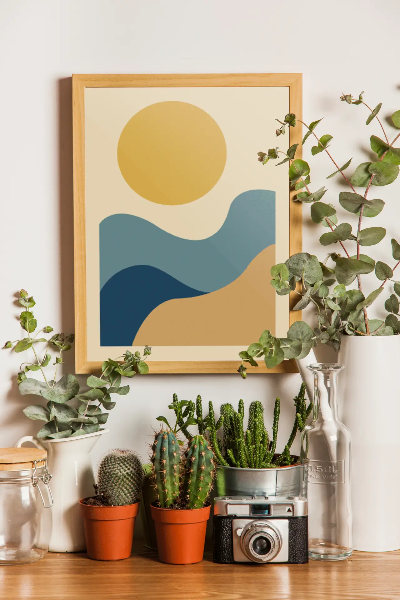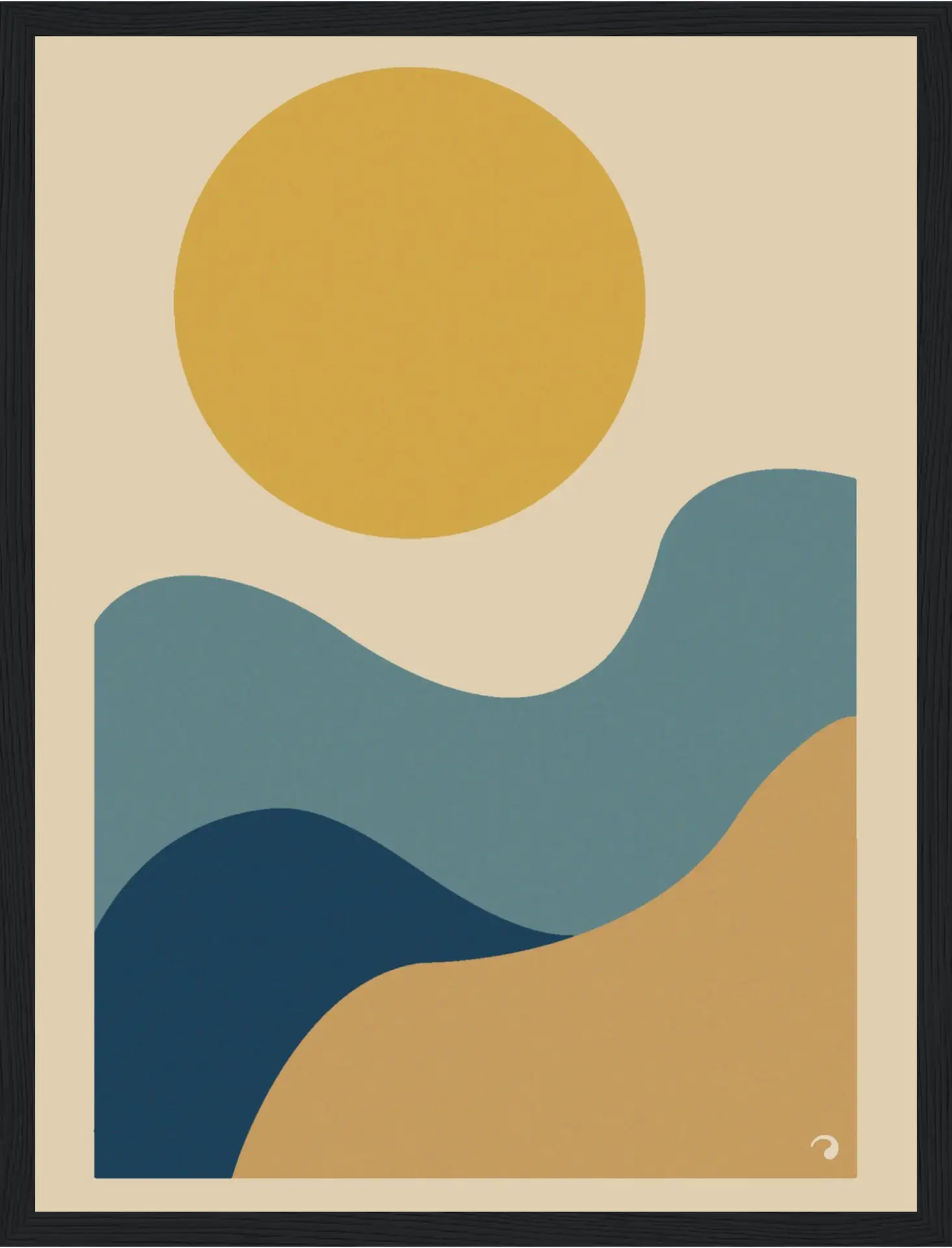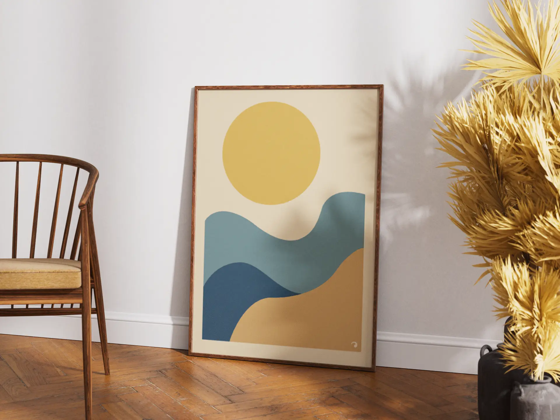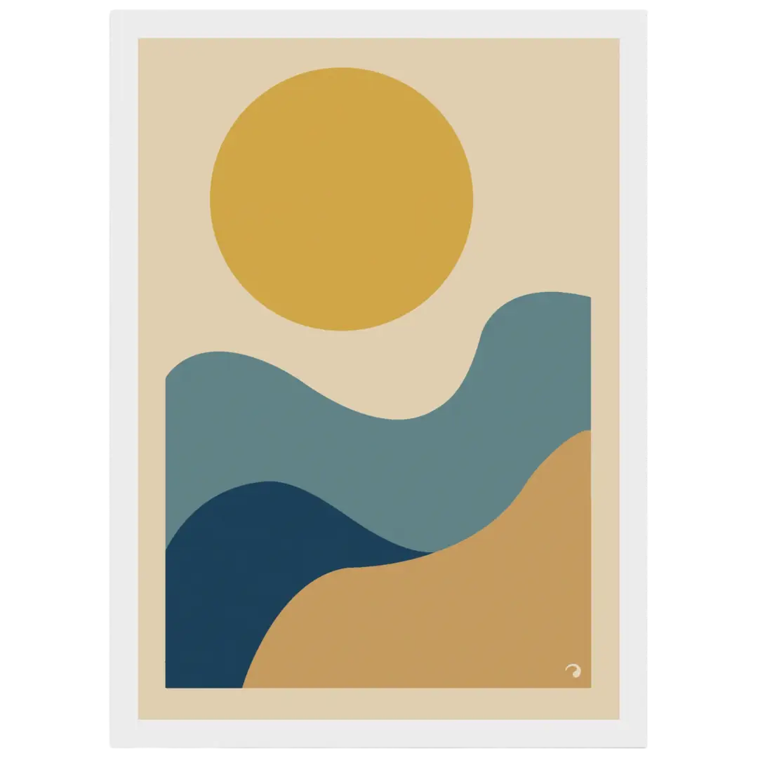 Avec “Horizons Solaires”, retrouvez la beauté simple des paysages méditerranéens : un grand soleil doré, des vagues bleues et des collines sableuses. Cette affiche abstraite apporte chaleur, lumière et élégance contemporaine à vos murs.